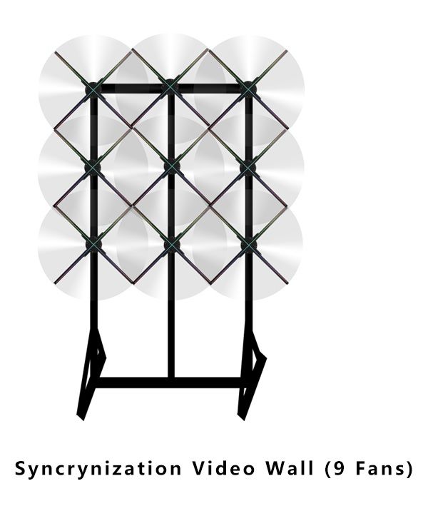 Multi-Fan Configuration: Uses 3x 65cm hologram fans arranged horizontally.