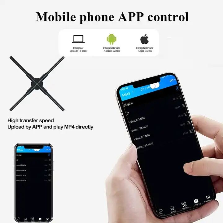 • WIFI Enabled & Mobile APP: Easily upload, manage, schedule, and control your holographic content wirelessly from your Android or iOS smartphone or tablet using the dedicated application.